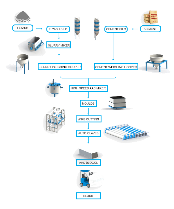 ACC(​Autoclaved Aerated Concrete) is a lightweight concrete, ACC has been widely using across the world past 6 decades.Autoclaved Aerated Concrete or ACC is made by mixing of Portland cement,lime,flyash,water and aluminum powder the final mixure is poured into moulds .The reaction between aluminum and lime causes microscpic hydrogen bubbles to form lower density concrete by expending it. After evaporation of the hydrogen and intitial setting, aerated concrete is cut into required sizes and cured by steam curing in pressurize chamber-Autoclaved or low pressurized-steam chambers.